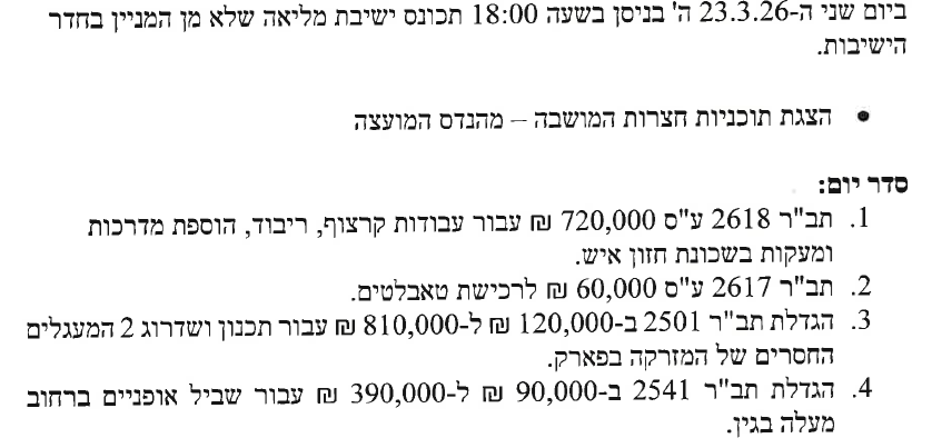 נושא חמישי: פרויקט חצרות המושבה יוצג בישיבת המועצה שלא מן המניין שתיערך הפעם ביום שני ה- 24/3 בשעה 18
