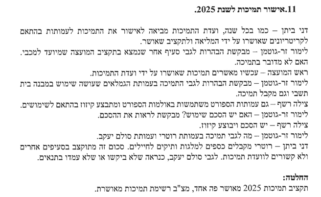 At the plenary session on July 1, 2025, the agenda item “Approval of Subsidies for 2025” was discussed. During the discussion of this item, I requested clarification, and the following was recorded in the minutes: “I request clarification regarding another item in the Council’s budget that is designated for Maccabi—is this not considered a subsidy?”
