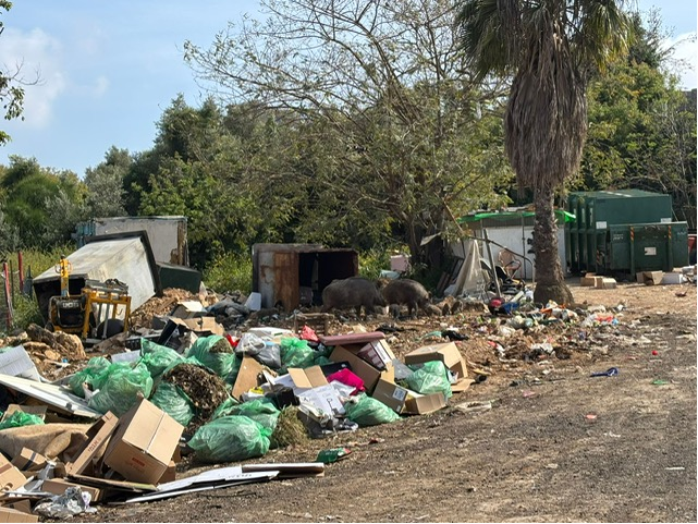 During the holiday, and as of yesterday at 4 p.m. when I arrived at the site and took these photos—there’s a new garbage dump in the heart of Zichron Ya’akov, on the grounds of the council’s operations department, on the way down from the winery toward Beit El. These are piles of stinking trash scattered in every direction by the wind, a 24/7 feeding ground for herds of wild boars (see the photos). And all of this is right where the council’s operations department is located. It’s ironic and infuriating that the Operations Department, which is responsible for keeping the town clean and collecting trash, has turned the very area it occupies into a massive, stinking dump.